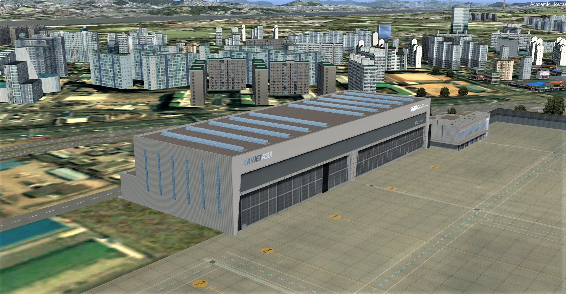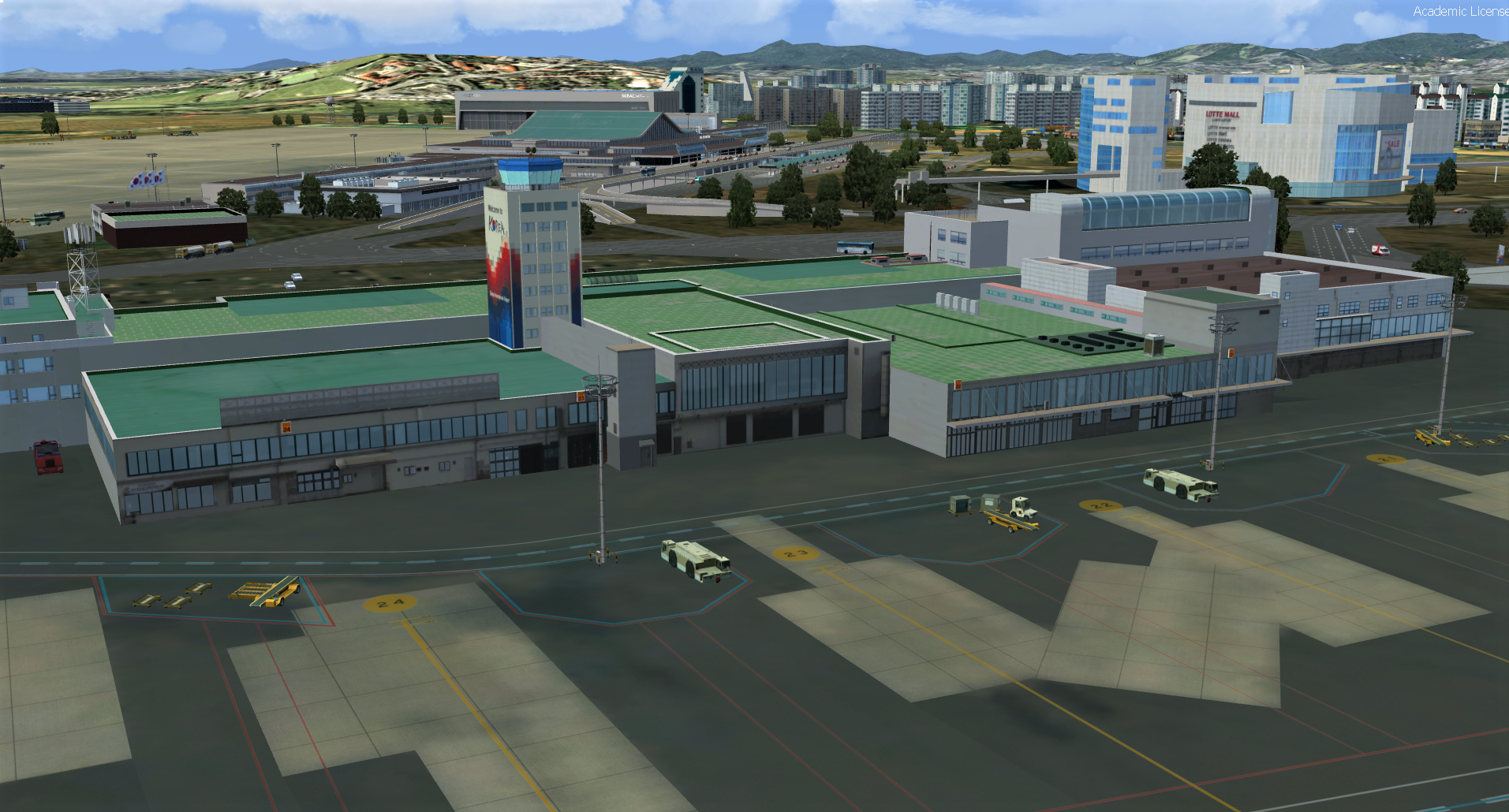 전체적인 모습입니다. 새로 리모델링 된 청사를 기준으로 제작이 되어 있고, 방화동이나 김포, 오쇠동 주변의 아파트와 건물들도 나름 구현을 해 놓았습니다. SODE를 이용해서 제트웨이가 실제로 작동되고, VDGS도 작동합니다.(실제 김포공항엔 없습니다.)