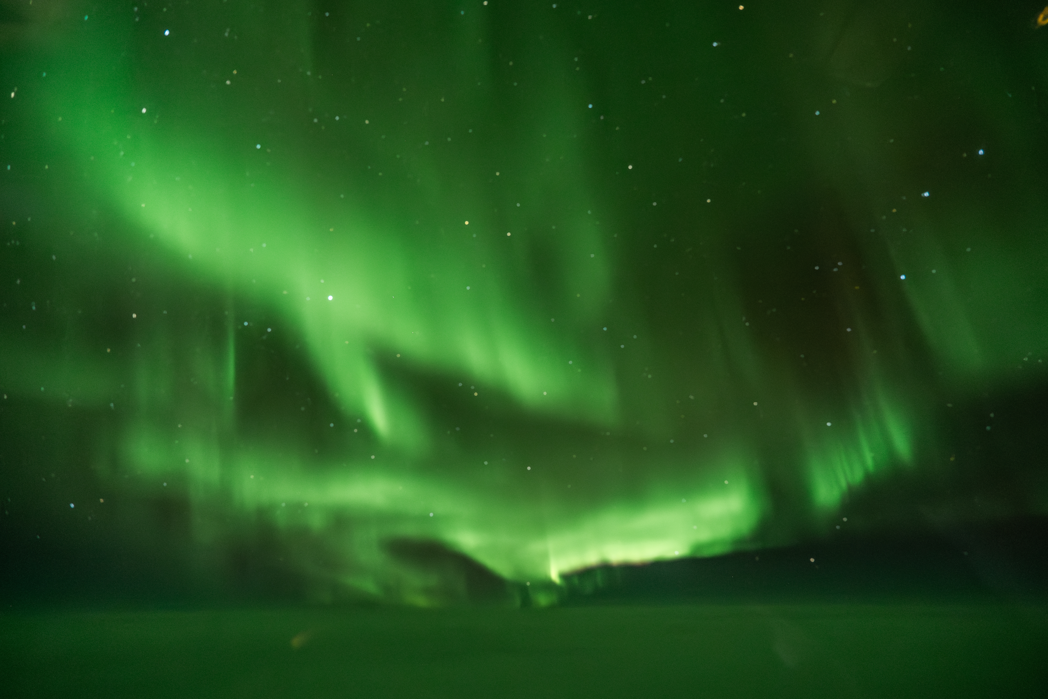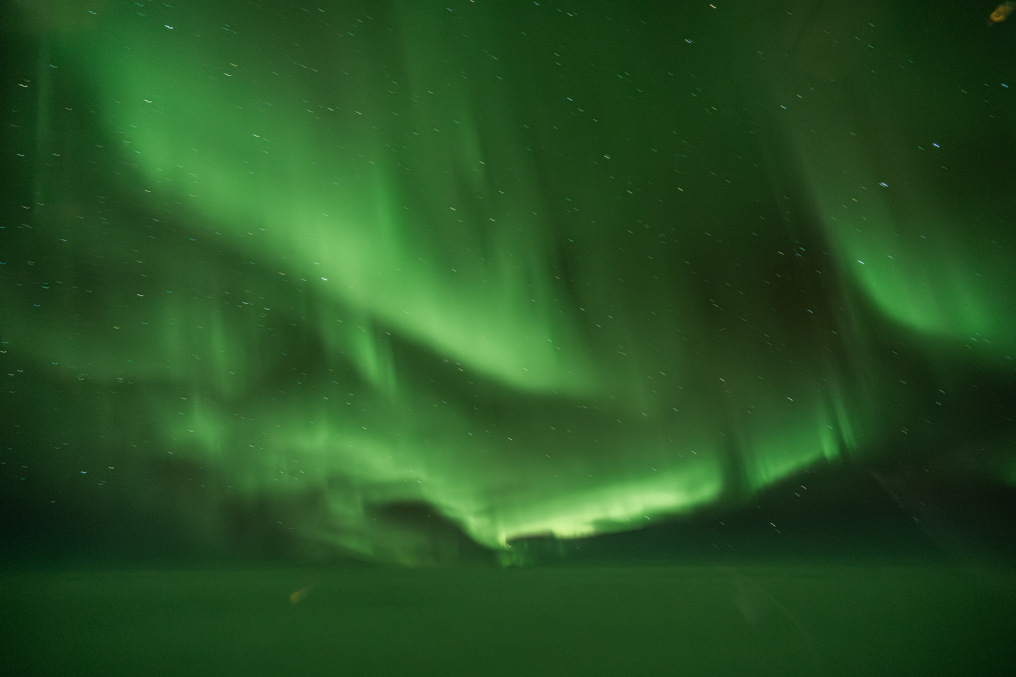 실제 오로라의 색깔은 진한 초록 색깔이 아니지만, 사진을 찍으면 완전히 진한 초록 빛으로 나온다. 실제 색깔은 흰색~ 초록 빛이며 내 생각에는 유리에 반사된 오로라의 빛 때문에 지표면도 초록 빛으로 보이는 것 같다. A7C+20-70mm F4.0 을 이용해서 촬영했고 노출은 2~3초 ISO는 16000을 적용했다. (사진은 휴식 중에 촬영하였습니다.)