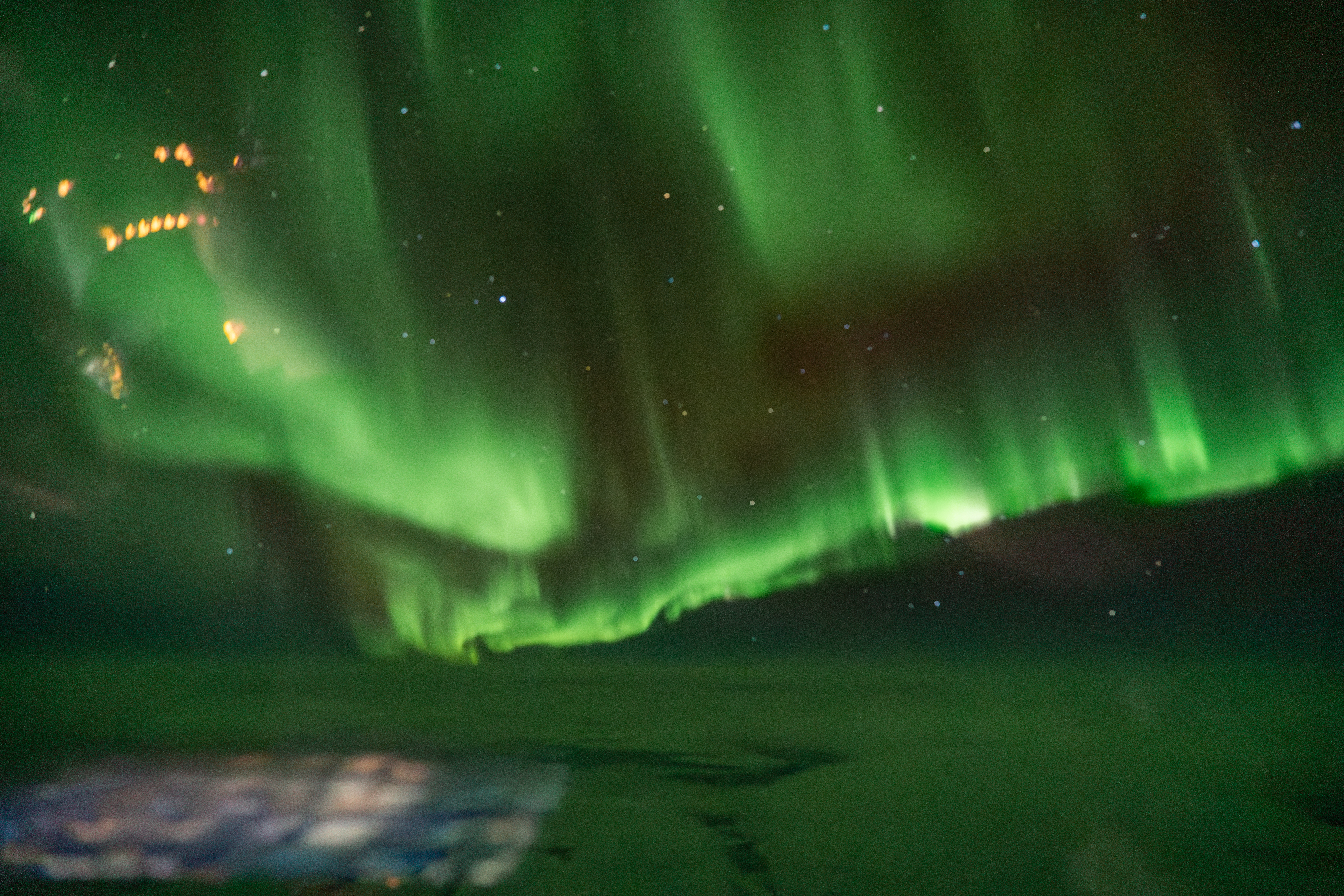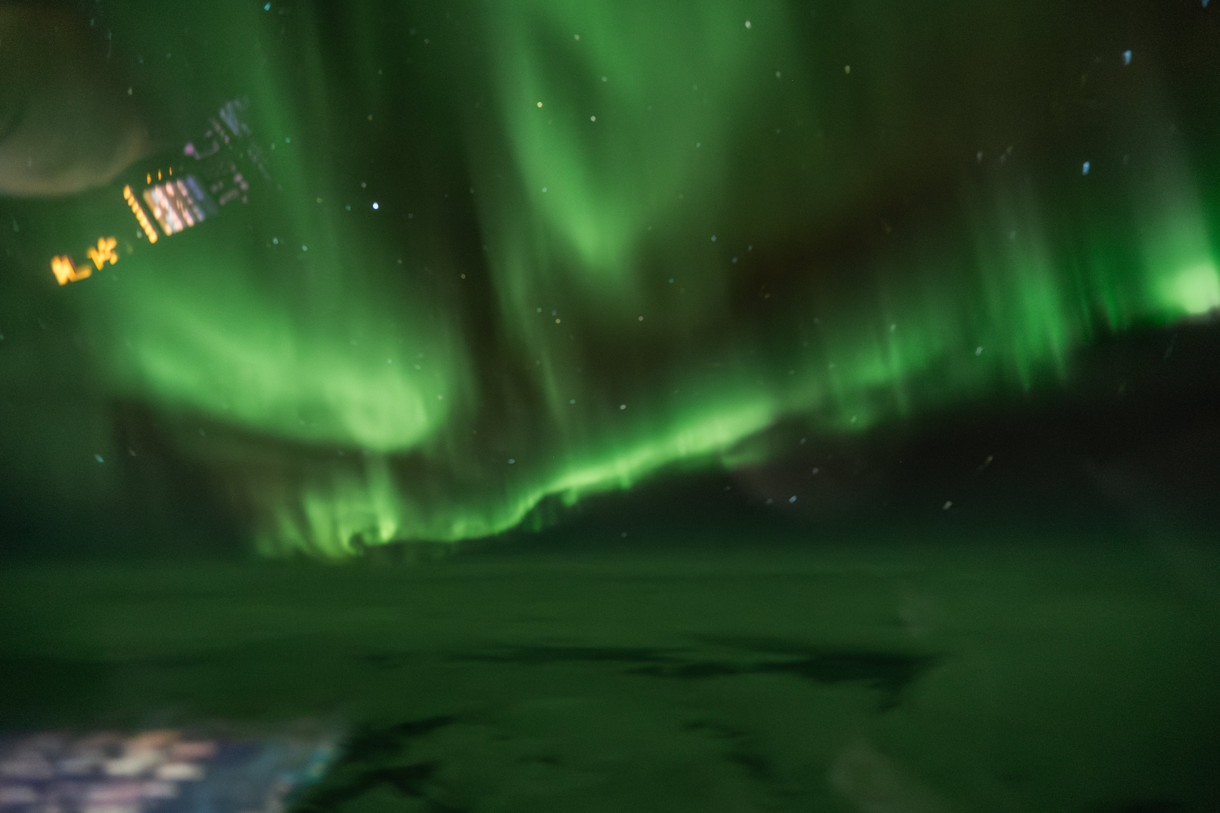 동영상으로 찍으려고 했는데 아무래도 어두운 배경에 오로라만 있는 터라 노출을 최대한 줘 보아도 찍히지 않았다. 다만, 눈으로는 오로라의 물결을 완벽히 감상할 수 있었다. 초록 태양풍들이 물결치는 모습.. 보기만해도 환상적이었다. 처음에는 조종석 앞쪽 유리를 통해 보았고, 비조금 지나다보니 오른쪽 측면에서 보였다. 아마 승객들도 이 오로라를 구경하지 않았을까? 창문 덮개를 열고 비행 중 오로라를 만났다면 엄청난 경험이었을텐데! 나였으면 엄청 호들갑 떨었을 지도..?