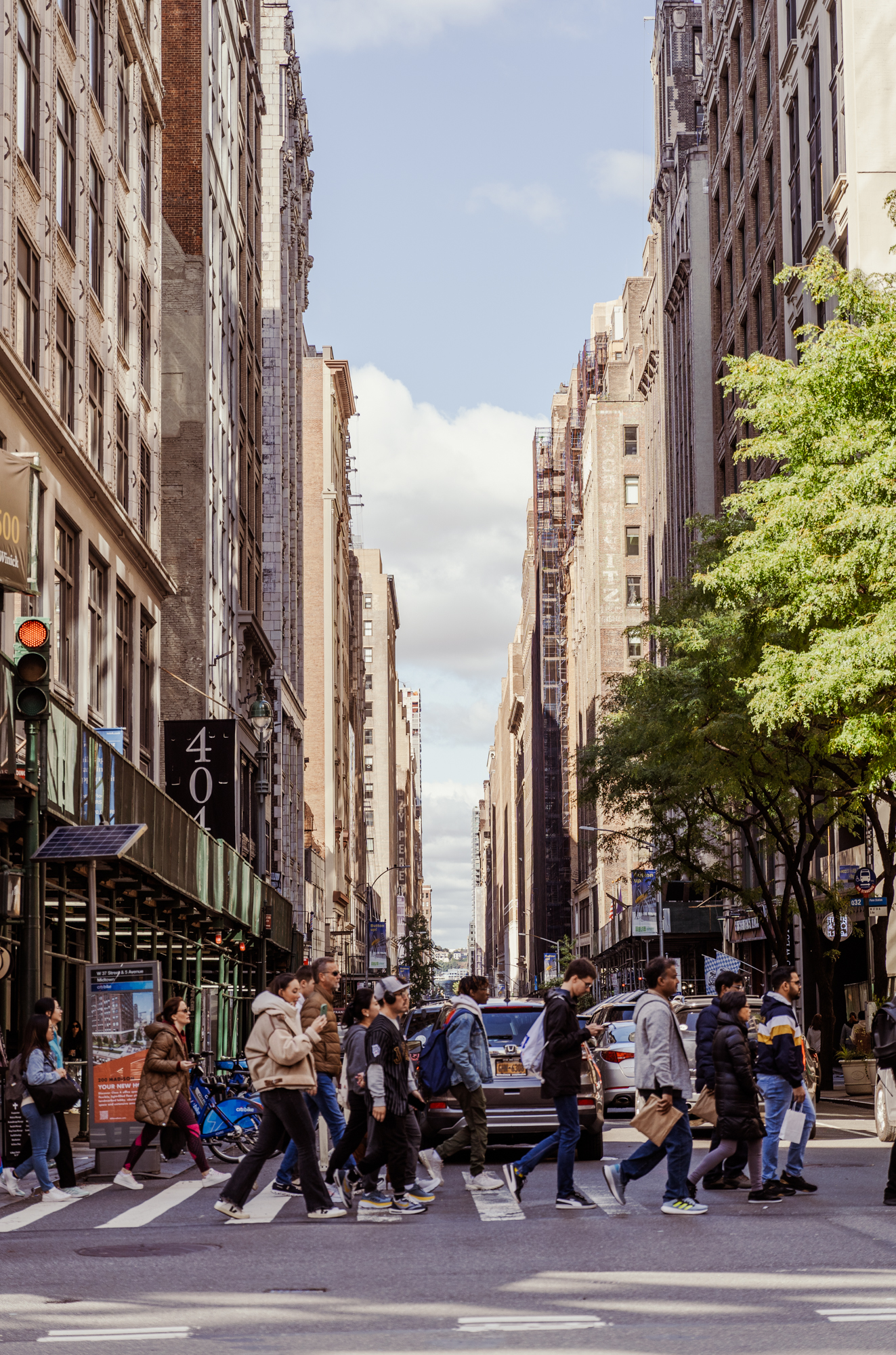 뉴욕의 도시는 격자 무늬로 설계되어 있는데, 그 블럭 하나하나를 걷다 보면 끝으로 보이는 바다나 걸치는 구름 같은 풍경들이 정말 멋있다. 사람들이 지나가는 사진을 찍었는데 그림 같은 화보가 나왔다. 만약 브루클린 브릿지 앞이라면 더 멋있겠지?