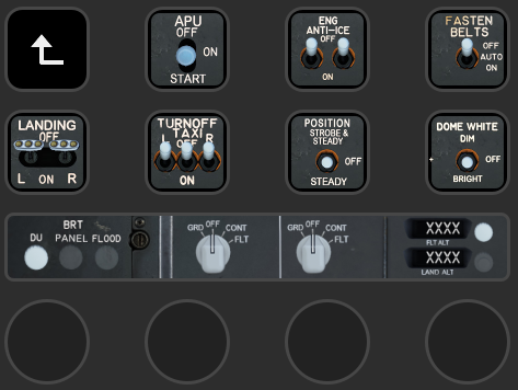 The Preflight and Engine Start-Up, as well as the Engine Shutdown processes, primarily require a mouse and keyboard for setup. Therefore, only the switches and buttons needed during actual flight (Hands-on Controller) are included (For example, switches like Anti-Collision Light, Logo Light, and most overhead panel switches are not included since they are not usually required during operations.)