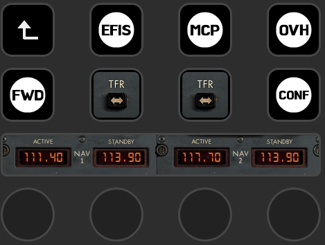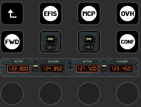 Each page can be navigated using buttons or by swiping left and right. (Order: EFIS - MCP - FWD - OVERHEAD - COM - NAV - CONF)